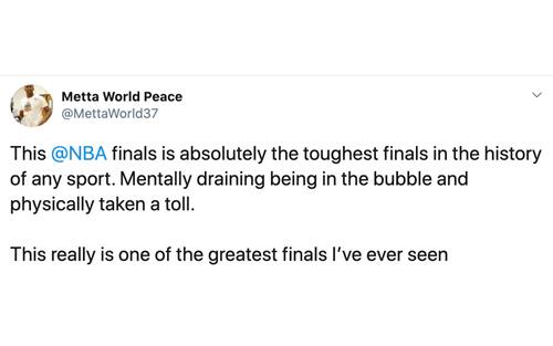 Metta World Peace invece riserva un applauso per tutti i giocatori in campo: "Le Finals NBA sono le più dure di qualsiasi sport. Mentalmente ti esaurisce essere nella bolla e fisicamente è un peso. Questa è davvero una delle più grandi finali che io abbia mai visto"