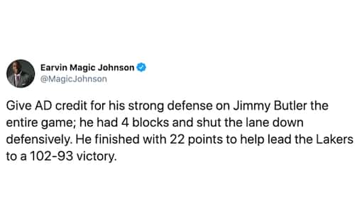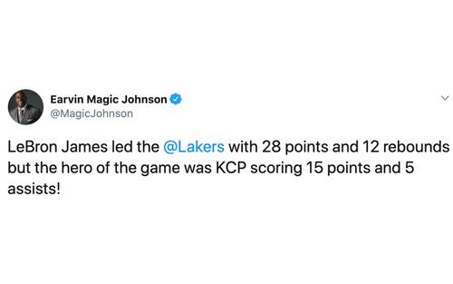 Al termine della partita, partono come sempre la raffica di tweet di Magic Johnson - carico come sempre dopo il successo di una squadra che ha contribuito a creare pur dimettendosi un anno e mezzo fa