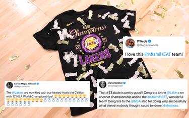 Sia durante che dopo la decisiva gara-6 che ha consegnato il titolo ai Los Angeles Lakers, sui social si sono susseguiti messaggi di complimenti tanto ai gialloviola quanto agli sconfitti Miami Heat. Da Vanessa Bryant a Magic Johnson fino a Dwyane Wade e gli altri giocatori della lega, ecco le reazioni al titolo dei Lakers