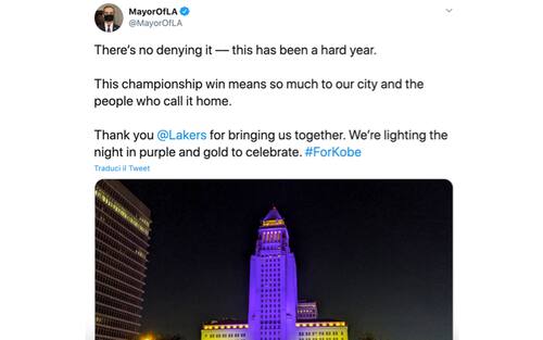 Il sindaco di Los Angeles si congratula con i Lakers e condivide una foto della città colorata di giallo e viola e l'hashtag #ForKobe