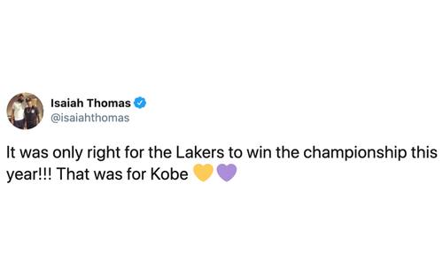 Al termine di gara-6, Vanessa Bryant è stata tra le prime a congratularsi con i Lakers, a partire da "Uncle P" (Rob Pelinka, GM gialloviola ed ex agente di Kobe). "Kobe aveva ragione, 'tieni duro ed elimina il rumore'. Vorrei che Kobe e Gigi fossero qui per vedere tutto questo"
