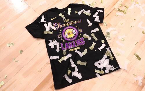 I Lakers l'avevano preparata anche 48 ore, ma soltanto in gara-6 sono riusciti a conquistare il successo decisivo per prendersi il titolo NBA: questa la maglietta celebrativa indossata durante la premiazione