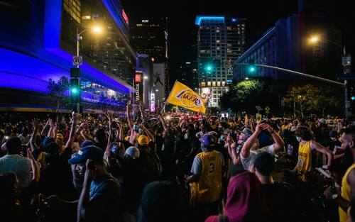 Fuori dallo Staples Center, migliaia di tifosi Lakers si sono radunati comunque per festeggiare il titolo NBA