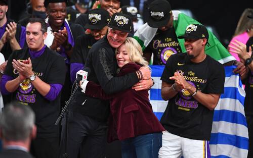 Un altro abbraccio molto significativo: quello tra Robert Pelinka e Jeanie Buss, i due volti della dirigenza gialloviola che, dopo anni complicati, sono riusciti a riportare i Lakers al vertice della NBA