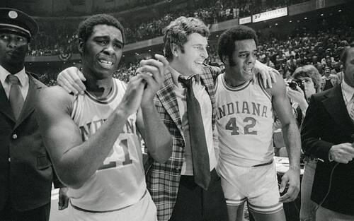 NCAA | QUINN BUCKNER, INDIANA HOOSIERS (1976) | Quasi in lacrime [maglia n°21, ndr], abbracciato dal suo allenatore Bobby Knight, Buckner festeggia il titolo NCAA conquistato con gli Hoosiers nel suo anno da senior, chiuso sotto i 9 punti a partita