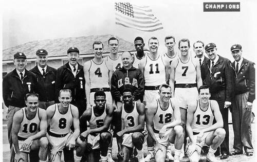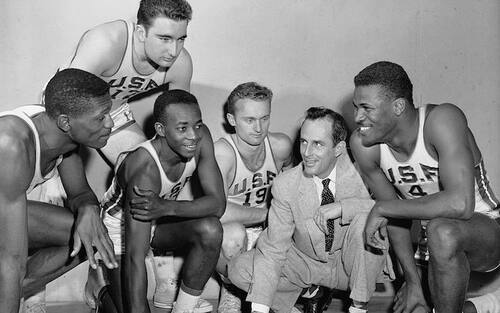 OLIMPIADI | BILL RUSSELL, TEAM USA (1956) | Si nasconde nella foto di gruppo [spunta solo il viso, al centro, in piedi, ndr], ma non si nasconde certo in campo: a Melbourne è il top scorer della nazionale USA che vince l’oro. Russell chiude l’Olimpiade con oltre 14 punti di media e quasi il 48% al tiro