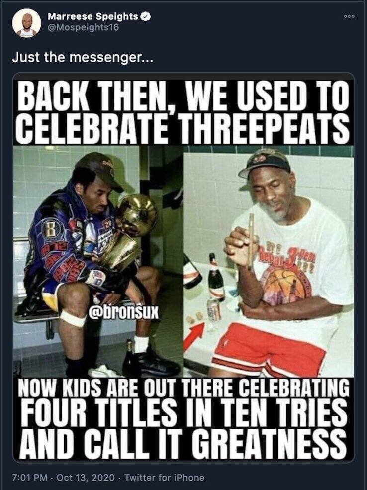 socialNon tutti hanno reagito allo stesso modo alla vittoria dei Lakers di LeBron James: c’è anche chi, tra i suoi ex avversari, ha voluto provocare il n°23 via social, tirando fuori il solito paragone con Jordan e Bryant: “Prima festeggiavamo i three-peat, adesso invece…”