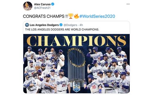Nella notte i Los Angeles Dodgers hanno sconfitto 3-1 i Tampa Bay Rays conquistando le World Series di baseball con il punteggio di 4-2 nella serie. Lo stesso dei Los Angeles Lakers nelle finali NBA contro i Miami Heat, facendo partire le celebrazioni sui social dei "cugini" gialloviola