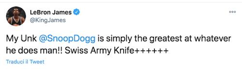 LEBRON JAMES | Anche il n°23 dei Lakers punta su Snoop Dogg e su come il famoso rapper sia riuscito a vestire i panni del telecronista: "Sei sempre il migliore in ogni cosa tu faccia, un coltellino svizzero"