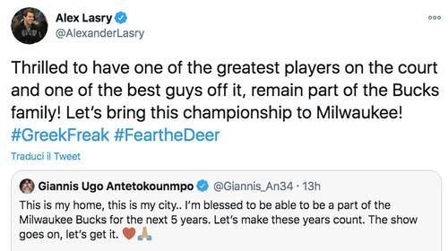 LA FIRMA DI ANTETOKOUNMPO | È stato il giocatore greco dei Bucks ad annunciare su Twitter la firma dell’estensione contrattuale che lo legherà a Milwaukee per i prossimi 5 anni: ed è proprio su Twitter che l’uomo che ha deciso di pagarlo così tanto — il proprietario dei Bucks Alex Lasry — ha espresso tutta la sua gioia: “Felicissimo che uno dei migliori giocatori in campo e una delle migliori persone fuori resti a far parte della famiglia dei Bucks! E ora portiamo il titolo NBA a Milwaukee!”. Ecco la top 10 dei contratti più ricchi mai elargiti in NBA