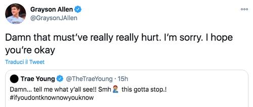 Dopo la gara tra Atlanta e Memphis del weekend la sfida è continuata sui social, con le accuse di Trae Young ai danni di Grayson Allen, la reazione (di scherno) dell'ex giocatore di Duke e l'intervento a sua difesa anche del suo compagno Jaren Jackson Jr.. Ma l'astio tra Young e Allen affonda le radici nel passato