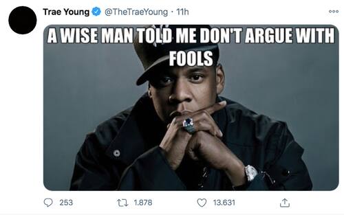 LA CHIOSA (SOCIAL) DI YOUNG | Davanti alla reazione di scherno di Allen e quella a difesa del compagno di Jackson Jr., la superstar degli Hawks ha reagito postando un’immagine di JAY Z accompagnata dalla scritta: “Un uomo saggio un giorno mi ha detto di non discutere con gli stupidi”. Finisce qui (forse) la polemica, in attesa che Hawks e Grizzlies si incontrino di nuovo in campo: ma bisognerà aspettare la seconda parte di stagione regolare