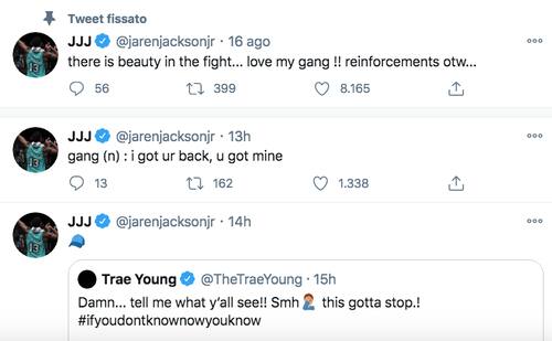 JAREN JACKSON A DIFESA DEL COMPAGNO | Assente in campo per via di un infortunio, ma presente sui social, ci ha pensato il lungo dei Grizzlies Jarren Jackson Jr. ad arrivare in soccorso del suo compagno sotto accusa: prima postando la definizione di “gang” (“Io difendo te, tu difendi me”) e poi twittando ancora: “C’è una certa bellezza nel gioco fisico: amo la mia gang, i rinforzi stanno per arrivare”