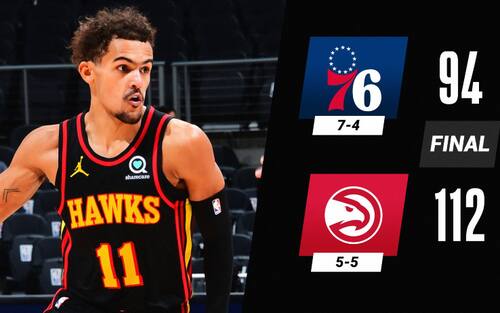 ATLANTA HAWKS-PHILADELPHIA 76ERS 112-94 | Trae Young raccoglie 26 punti in 25 minuti nel successo Hawks che approfittano delle tante assenze in casa Sixers e tornano a sorridere dopo una settimana complicata. Tutto il quintetto di Atlanta chiude in doppia cifra, con John Collins che tira e segna solo dall’arco (4/7, 12 punti) e Clint Capela che mette a referto una doppia doppia - 12 punti e 11 rimbalzi con 12 tiri