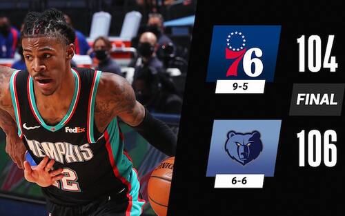MEMPHIS GRIZZLIES-PHILADELPHIA 76ERS 106-104 | Memphis festeggia nel migliore dei modi il ritorno in campo dopo otto gare d’assenza - causa infortunio alla caviglia - di Ja Morant: i Grizzlies si regalano il quarto successo in fila, battendo in volata i Sixers scesi in campo senza Joel Embiid. Sono sette i giocatori in doppia cifra tra i padroni di casa, che tengono per l’ottava volta consecutiva il proprio avversario al di sotto dei 110 punti segnati