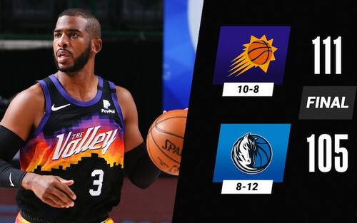 DALLAS MAVERICKS-PHOENIX SUNS 105-111 | Senza Devin Booker alle prese con un problema al bicipite femorale, è Chris Paul a caricarsi i Suns sulle spalle firmando un parziale di 15-3 per decidere la partita. Il playmaker segna 16 dei suoi 27 punti nell’ultimo quarto, distribuendo 12 assist per i compagni tra cui spiccano la doppia doppia da 18+17 di Deandre Ayton e i 14 a testa di Mikal Bridges e Jae Crowder, trovando il secondo successo consecutivo