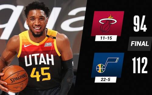 UTAH JAZZ-MIAMI HEAT 112-94 | Prova di forza impressionante dei Jazz, che in back-to-back dopo il successo su Milwaukee e in una serata in cui il tiro da tre punti non li assiste (12/46) schiantano anche i vice-campioni in carica conquistando la 18^ vittoria nelle ultime 19 gare disputate, la settima in fila. Il merito è soprattutto della difesa, che tiene gli avversari a 15 punti in un terzo quarto cominciato con un parziale di 16-0 dai padroni di casa