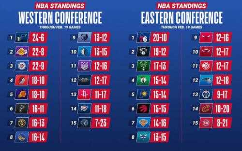 Si interrompe a nove la striscia di vittorie dei Jazz, sconfitti sul campo dei Clippers al completo. Joel Embiid e Jamal Murray segnano 50 punti a testa nei successi di Philadelphia e Denver. Milwaukee torna a vincere dopo cinque ko in fila, Golden State cade a Orlando con la tripla doppia di Vucevic. Atlanta ko a Boston (Gallinari 9 punti), Phoenix rimonta 11 punti nel quarto finale a New Orleans, successi per Memphis e Toronto