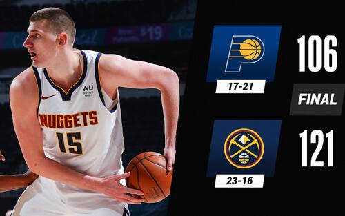 DENVER NUGGETS-INDIANA PACERS 121-106 | Una gara complicata sin dal prepartita per i Pacers, atterrati in ritardo e con enorme disagio a causa della neve a Denver da Phoenix e costringendo così la NBA a far slittare la palla a due: un ritardo che Indiana sembra pagare anche in campo, in svantaggio prima dell’intervallo lungo e poi tornata di prepotenza in gara grazie al 35-22 di parziale nella terza frazione. Tutto si decide però nell’ultimo quarto, quando i Nuggets dimostrano di avere più energie (34-15 i punti segnati) e vincono senza problemi