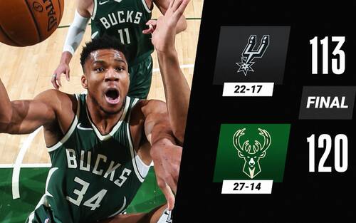 MILWAUKEE BUCKS-SAN ANTONIO SPURS 120-113 | Sesta vittoria consecutiva per i Bucks che dimostrano sempre più di aver trovato ritmo e continuità di risultati in questa seconda parte di regular season, abili a ribaltare il vantaggio Spurs di 14 lunghezze accumulato nel primo tempo. Alla sirena finale sono 26 punti e 15 assist - massimo in carriera eguagliato - per Giannis Antetokounmpo, che sfiora la tripla doppia con i suoi 8 rimbalzi, a cui si aggiungono i 23 punti realizzati da Khris Middleton
