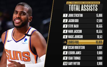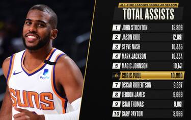 Una della point guard più efficaci della storia e a detta di molti un talento in grado di avere visione che raramente aveva calcato un parquet NBA: Chris Paul ha raggiunto così quota 10.000 assist in carriera; il sesto all-time in NBA. E tra meno di 500 punti potrebbe entrare in un altro club talmente esclusivo da non aver ancora accolto nessuno: unico giocatore di sempre con 10k assist e 20k punti, semplicemente Point God. Di seguito la top-10 con i passatori più prolifici di sempre