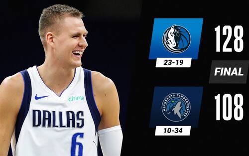 MINNESOTA TIMBERWOLVES-DALLAS MAVERICKS 108-128 | Per una volta non è Luka Doncic l’uomo copertina della vittoria Mavs. Lo sloveno si ferma a 15 punti con 6/16 al tiro nella serata che vede protagonista Kristaps Porzingis, miglior marcatore dei suoi a quota 29, con 11/23 al tiro e anche 9 rimbalzi. La panchina di coach Carlisle confeziona la bellezza di 56 punti, guidata dai 21 con 5 triple di Tim Hardaway Jr. e dai 16 a testa di Dwight Powell e Jalen Brunson, che aggiunge anche 11 rimbalzi