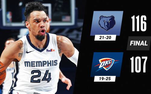 OKLAHOMA CITY THUNDER-MEMPHIS GRIZZLIES 107-116 | Dillon Brooks eguaglia il suo massimo in stagione da 25 punti e Memphis torna così in positivo con il record (21-20) anche grazie ai 20 punti a referto di Grayson Allen e ai 16 con 15 rimbalzi di Jonas Valanciunas - reduci da un ottimo momento di forma, tenendo conto dei quattro successi nelle ultime cinque gare. Sotto di 12 lunghezze nella terza frazione, i Grizzlies hanno chiuso la frazione con un parziale da 33-12 che ha segnato la sfida