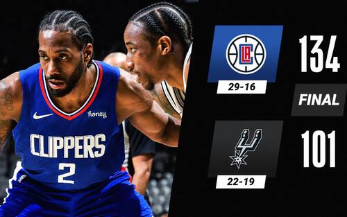 SAN ANTONIO SPURS-L.A. CLIPPERS 101-134 | I Clippers travolgono gli Spurs dal primo quarto (41 punti a referto) all’ultimo (concessi solo 17 punti ai texani) sotto la leadership di un ex mai dimenticato all’ombra dell’Alamo, Kawhi Leonard (fischiato dai pochi tifosi presenti). Per la superstar dei Clippers una gara quasi perfetta da 25 punti con 9/12 al tiro, 7 rimbalzi, 5 recuperi e 3 assist, ma coach Lue ha 20 punti anche da Marcus Morris, 17 da Paul George e 49 dalla panchina, guidata dai 16 di Lou Williams, che raggiunge i 15.000 punti in carriera