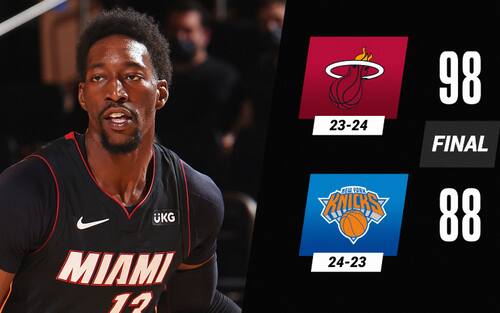 NEW YORK KNICKS-MIAMI HEAT 88-98 | Una striscia di sconfitte che si interrompe (a 6, quella di Miami), una di vittorie che va in fumo (a 3, quella di New York): Jimmy Butler e Bam Adebayo — 27 punti il primo, 20 con 17 rimbalzi il secondo — fanno riassaggiare il gusto del successo ai campioni della Eastern Conference in carica, che hanno anche 18 punti da Tyler Herro e 14 da Duncan Robinson, entrambi con 4/9 da tre punti. Decisivo un terzo quarto da 39-21 per gli Heat, che avevano chiuso sotto di 7 il primo tempo