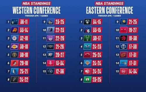 Questa la situazione nelle due classifiche dopo le gare della notte. Ricordiamo che le squadre dalla settima alla decima posizione si giocheranno gli ultimi due posti per i playoff in un torneo play-in da disputare tra il 18 e il 21 maggio per accedere al primo turno