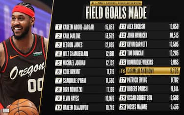 Nonostante il 2/12 al tiro e la modesta serata da 6 punti in uscita dalla panchina nella sconfitta contro Milwaukee, Carmelo Anthony ha trovato il modo di battere un altro record e salire un ulteriore scalino nella storia NBA - superando Patrick Ewing, altra leggenda come lui dei Knicks, per numero totale di canestri dal campo in carriera. Questa la top-20 all-time, ennesima graduatoria piena di talenti che hanno fatto la storia della NBA e che vede, oltre al giocatore dei Blazers, anche LeBron James al suo interno