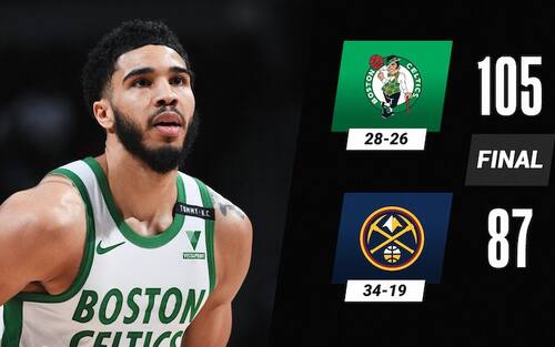 DENVER NUGGETS-BOSTON CELTICS 87-105 | Partita assurda tra Nuggets e Celtics: Denver controlla a piacimento per tre quarti, ma poi stacca completamente la spina e Boston chiude la gara con un parziale di 40-8 spinto dai 28 punti di Jayson Tatum e i 20 di Jaylen Brown. Nikola Jokic fa quello che vuole firmando una tripla doppia da 17+10+11, ma deve uscire nervosissimo a 4 minuti dalla fine - a gara ormai compromessa - per evitare di essere espulso