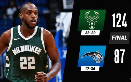 ORLANDO MAGIC-MILWAUKEE BUCKS 87-124 | Vittoria larga e mai in discussione in trasferta per i Bucks che passeggiano a Orlando nonostante l’assenza di Giannis Antetokounmpo - fuori per la quinta gara in fila, alle prese con un fastidio al ginocchio sinistro. Ci pensa Khris Middleton, autore di 21 punti, 8 rimbalzi e 5 assist, con 8/13 dal campo e 1.000 triple a bersaglio in carriera da festeggiare, a cui si aggiungono le 19 complessive di squadra segnate da Milwaukee in quello che è il primo successo Bucks dopo tre ko consecutivi