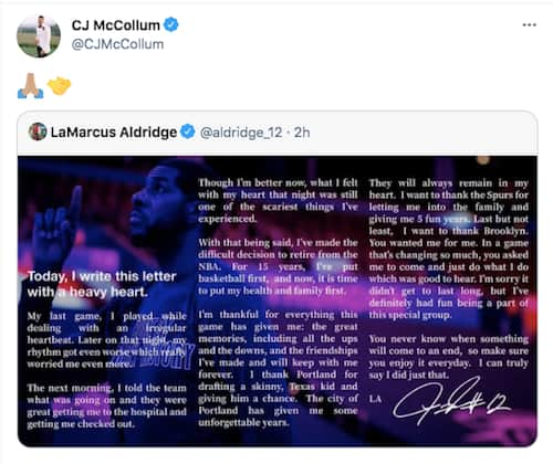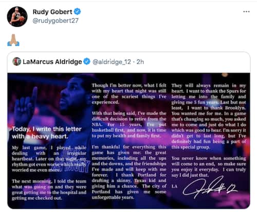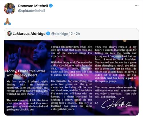 La rivelazione di LaMarcus Aldridge e la decisione di ritirarsi a seguito dei problemi cardiaci riscontrati negli ultimi giorni durante le prima partite in carriera con i Nets, hanno colto di sorpresa l’intero mondo NBA - all’interno del quale l’ex n°12 dei Blazers ha stretto legami che vanno ben oltre la pallacanestro, come raccontano le tante dimostrazioni d’affetto e gli attesti di stima arrivati sui social in suo onore