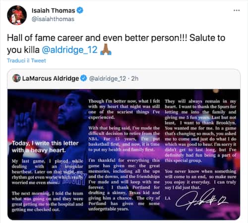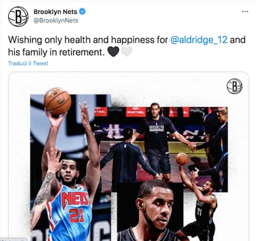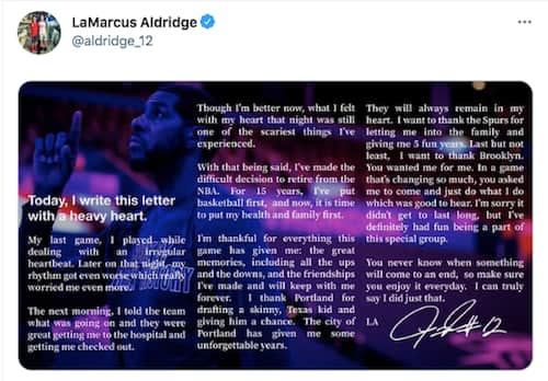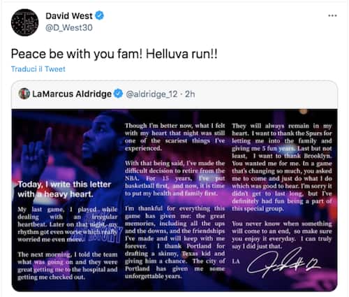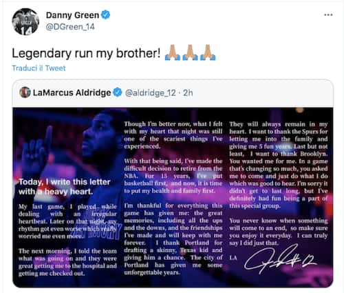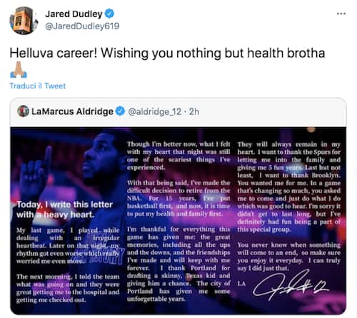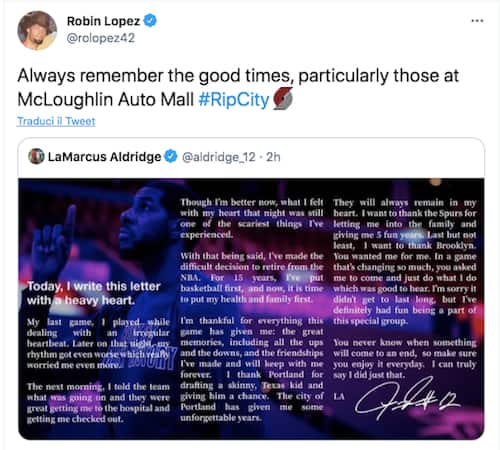 La lettera che Aldridge ha affidato ai social per annunciare al suo ritiro è l'ultimo atto di una carriera NBA durata 15 anni e divisa tra Portland e San Antonio, con l'ultima breve parentesi a Brooklyn - interrotta troppo presto e a sorpresa dopo i problemi al cuore. Un messaggio rilanciato da tanti giocatori NBA sui social per salutarlo