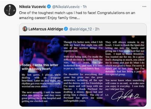 NIKOLA VUCEVIC | Spesso avversari in campo, ma sempre con enorme rispetto: il lungo montenegrino dei Bulls saluta Aldridge sottolineando come per lui sia stato "uno dei testa a testa più complicati da affrontare sul parquet in NBA"