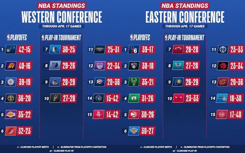 Questa la situazione in classifica dopo le gare della notte. Ricordiamo che dal 18 al 21 maggio si terrà il torneo play-in tra le squadre dalla settima alla decima posizione per determinare le ultime quattro partecipanti ai playoff (due per conference)
