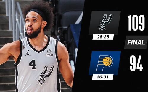 INDIANA PACERS-SAN ANTONIO SPURS 94-109 | L’ottimo avvio degli Spurs regala a San Antonio un importante successo in trasferta a Indianapolis, approfittando dei 16 punti segnati nel solo primo quarto da Derrick White (25 in totale) e cavalcando un Jakob Poeltl da 16 punti e 7 rimbalzi sotto canestro per condannare i Pacers al terzo ko in fila. I ragazzi di coach Gregg Popovich restano così in linea di galleggiamento, tenendo a debita distanza i Pelicans e la loro 11^ posizione a Ovest - al momento con ben quattro sconfitte in meno