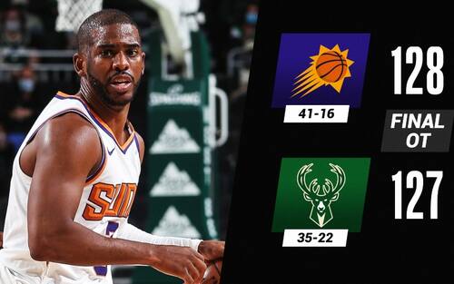 MILWAUKEE BUCKS-PHOENIX SUNS 127-128 OT | Il tiro libero a bersaglio realizzato da Devin Booker a tre decimi di secondo dal termine del primo tempo supplementare spezza definitivamente l’equilibrio e regala ai Suns il successo al termine di una battaglia equilibrata e spettacolare tra due delle migliori squadre NBA. Dopo la tripla dell’ennesima parità firmata Khris Middleton a 22 secondi dalla fine dei 5 minuti supplementari, a far discutere è stata la chiamata arbitrale sulla giocata difensiva di PJ Tucker - ingenuo ad avvicinarsi troppo a Booker in fase di tiro
