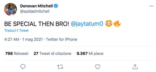 DONOVAN MITCHELL, UTAH JAZZ | È infortunato, non può scendere in campo, ma questo non ferma “Spida” Mitchell dal seguire da vicino cosa succede in giro per la lega: e congratularsi con il collega per essere un giocatore “speciale”