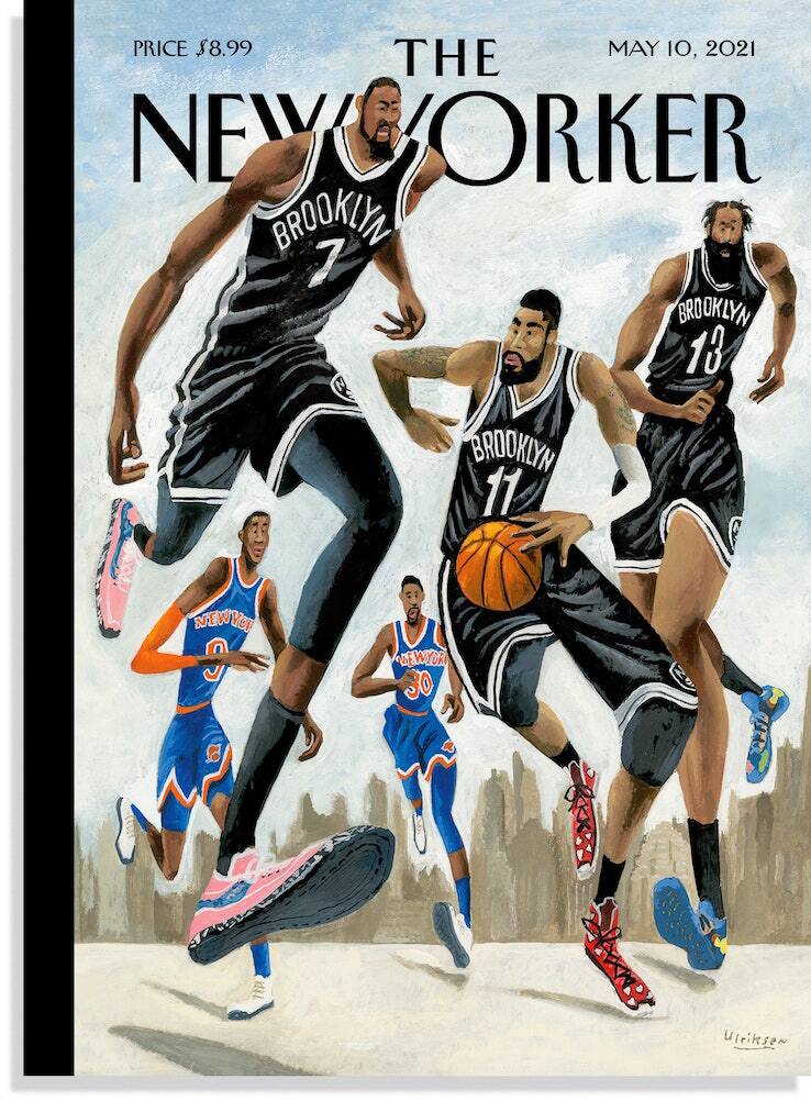 Una squadra (i Nets) sta battagliando per il primo posto nella Eastern Conference. L’altra (i Knicks) è saldamente al quarto posto. Entrambe sono praticamente certe — i bluarancio devono ancora centrare la sicurezza aritmetica — di prender parte ai playoff NBA che prenderanno il via l'ultima settimana di maggio. E allora -- come titola l’ultima copertina del prestigioso settimanale americano “The New Yorker” — ci sono “Hoop dreams in New York”. Nella Grande Mela si torna a sognare, grazie ai “Big Three” (Irving-Harden-Durant) da una parte e alla coppia rivelazione Julius Randle (neo-All-Star) e R.J. Barrett dall'altra. E in copertina — ritratti nella bellissima illustrazione di Mark Ulriksen, newyorchese grande appassionato di sport — ci sono proprio loro, il n°7, il n°11 (palla in mano) e il n°13 di Brooklyn inseguiti sullo sfondo dal n°9 e del n°30 di New York. Sono loro, si legge sulle pagine del New Yorker, “a rendere nuovamente orgogliosa un’intera città” e Ulriksen concorda: “New York è sempre stata una città di pallacanestro. E un conto è se fanno bene i Nets, con il loro trio di superstar, ma quello che fa veramente esaltare la città sono le performance dei Knicks. Hanno fatto pena da sempre — ammette l’artista che oggi è di base a San Francisco — ma ogni squadra può avere un brutto mezzo secolo”, commenta ironico.