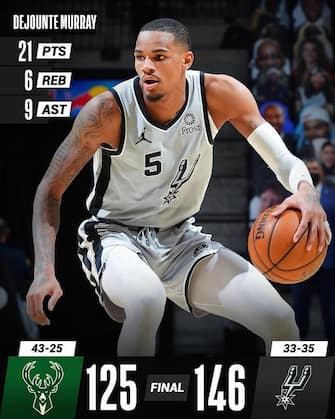 SAN ANTONIO SPURS-MILWAUKEE BUCKS 146-125 | Gli Spurs riscattano la brutta sconfitta con Portland travolgendo i Bucks con un +21. Primo tempo praticamente perfetto per la squadra di Popovich che a metà partita ha già segnato 87 punti (record di franchigia). Il milgiore è DeRozan che chiude con 23. A quota 20 punti anche Dejounte Murray (21 con 9 assist), Keldon Johnson (20) e Patty Mills (20 con 6/9 da tre). San Antonio chiude con il 58,6% dall'arco (17/29).