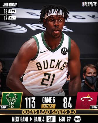 MIAMI HEAT-MILWAUKEE BUCKS 84-113 | Dura meno di tre quarti la sfida tra Milwaukee e Miami, il colpo del 3-0 firmato dai Bucks che appare come quello del ko per gli Heat - incapaci di andare oltre i 36 punti realizzati nell’intero primo tempo. Gli ospiti stravincono la lotta a rimbalzo (56-41), costringendo Miami a non andare oltre il 38% dal campo: nella partita più importante della stagione - giocata davanti a ben 17.000 tifosi sui circa 20.000 posti dell’arena di Miami - Jimmy Butler e compagni non riescono a invertire la tendenza in una serie segnata