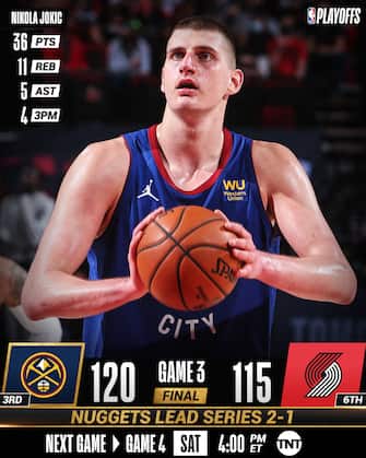 PORTLAND TRAIL BLAZERS-DENVER NUGGETS 115-120 | Vittoria in volata per i Nuggets che battono a domicilio Portland in una cruciale gara-3 e si riprendono il fattore campo a favore, colpendo a ripetizione dall’arco in quella che è la miglior serata dall’arco della stagione per Denver: 20/38 dall’arco (12 nel solo primo tempo, record di franchigia ai playoff), un 52.6% che mette spalle al muro i Blazers, puniti anche da un Austin Rivers da 21 punti con 5/10 dall’arco, decisivo nel quarto periodo