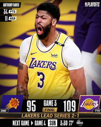 Alla sirena finale la prestazione da copertina è, come accaduto 48 ore fa, quella di un Anthony Davis scintillante: 34 punti - 18 dei quali firmati nella terza frazione - a cui aggiunge 11 rimbalzi, 12/14 dalla lunetta e un dominio in area in difesa che condiziona non poco i Suns ogni volta che provano ad arrivare al ferro in penetrazione. Phoenix infatti scivola in doppia cifra di svantaggio non appena il tiro da tre punti inizia a venir meno, travolta 58-38 nella conta dei punti in area realizzati in favore dei Lakers