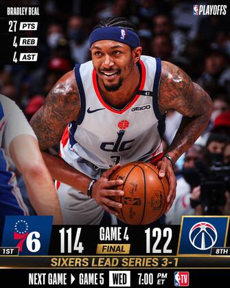 WASHINGTON WIZARDS-PHILADELPHIA 76ERS 122-114 | Gli Wizards battono un colpo, evitano l’eliminazione e il cappotto superando in gara-4 i Sixers e conquistando d’orgoglio il primo successo nella serie - impedendo al tempo stesso a Philadelphia di concludere il primo 4-0 nella storia della franchigia degli ultimi 36 anni. Merito dei 27 punti con 9/23 dal campo di Bradley Beal che guida un quintetto tutto in doppia cifra e grazie a un dominante Robin Lopez da 16 punti con 8/11 al tiro raccolti a gara in corso
