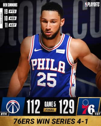 PHILADELPHIA 76ERS-WASHINGTON WIZARDS 129-112 - SERIE (4-1) | I Sixers tengono a riposo l’infortunato Joel Embiid e battono lo stesso gli Wizards in gara-5, condannando Westbrook&Beal a iniziare anticipatamente la offseason rispetto ai loro programmi. Merito di un secondo tempo in cui Washington subisce 64 punti e non tiene il passo dei padroni di casa, nonostante un Rui Hachimura da 21 punti con 8/13 dal campo - abile a sfruttare l’assenza di Joel Embiid a protezione del ferro - e il 49.4% raccolto di squadra al tiro