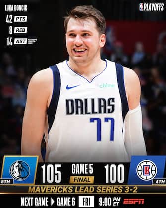 L.A. CLIPPERS-DALLAS MAVERICKS 100-105 - SERIE (2-3) | Rimandato ancora una volta l’appuntamento con un successo casalingo in una serie in cui a sorridere è per la quinta gara consecutiva la squadra in trasferta: Dallas infatti parte forte, stringe i denti, allunga nel terzo quarto approfittando dei problemi di falli di Paul George (20-3 il parziale poi rivelatosi decisivo) e lotta in un quarto periodo da soli 16 punti segnati in 12 minuti, portando a casa un 3-2 che mette spalle al muro i Clippers