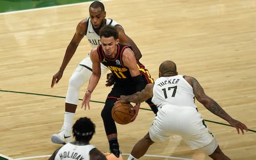 La storia della partita è certamente la pressione difensiva dei Bucks su Trae Young. Jrue Holiday ha fatto un lavoro decisamente migliore nello stare addosso alla stella degli avversari, portandolo a commettere ben 8 palle perse nel solo primo tempo (9 alla fine, sua peggior prestazione personale in carriera) e tirare 6/16 dal campo con 1/8 da tre e 2/3 ai liberi, occupando anche le linee di passaggio per tenerlo a soli 3 assist in 28 minuti di gioco