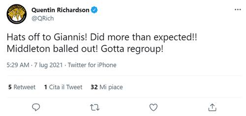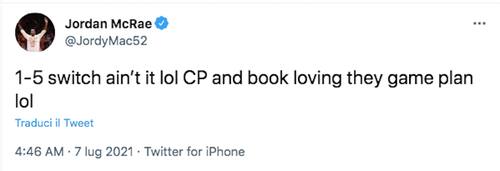 Occhi incollati sul primo atto della finale NBA non solo tra i tifosi di tutto il mondo ma anche tra i tantissimi giocatori NBA che, pur non potendoci partecipare, non vogliono perdersi lo spettacolo più bello della stagione NBA, che assegna l'anello alla squadra più forte. Ecco come hanno reagito tanti protagonisti NBA davanti alla gara iniziale della serie tra Suns e Bucks